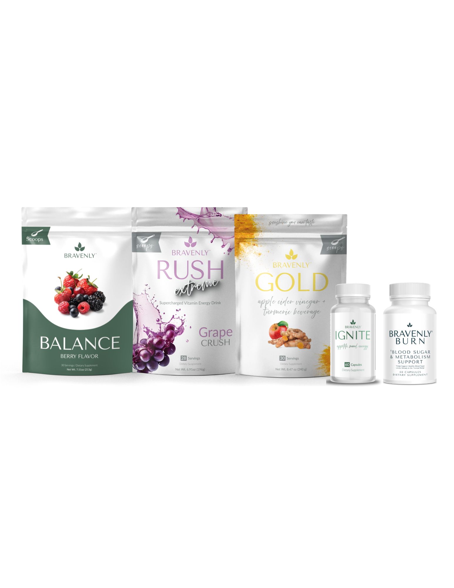Incluye: Burn, Ignite, Gold (cucharadas o cápsulas), Balance (cucharadas) y tu elección de Rush, Rush Extreme o Brew Extreme (cucharadas).